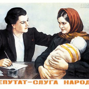 Soviet social poster. Caption reads, "Депутат -- слуга народа / Deputat -- sluga naroda", meaning, "A deputy is a people's servant". [Description English/roman)]