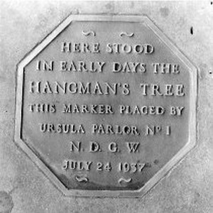 Photo of a marker in Jackson, Ca, identifying the location of Hangman's Tree. The Native Daughters of the Golden West placed the marker.