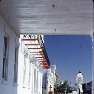 Old Sacramento. View of the Clarendon House apartment building on the corner of Second and L Streets. This view is during redevelopment
