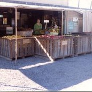 Photo--color: The Hallberg Apple Farm roadside stand 1982. Boxes of various apples at the entrance of the stand. Marcia Hallberg in green blouse.