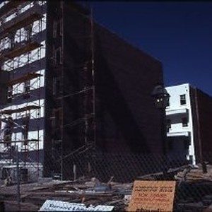 Old Sacramento. View of the Clarendon House apartment building on the corner of Second and L Streets. This view is during redevelopment