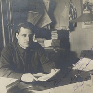 A photograph of Mikhail Timoshenko in 1924. Handwritten note at the right lower corner reads, "Lish' shipov kusty vizhu ia vokrug! M. Timozhenko. 22/iv 24 g. Moskva/ Лишь шипов кусты вижу я вокруг. М. Тимошенко. 22/iv 24 г. Москва", meaning, "Only bushes with thorns can I see around. M. Timoshenko. 04/22/1924 Moscow". [Description English/roman)]
