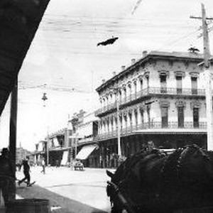 "3rd Street looking north from S.E. corner of 3rd and J Sts." Horse and wagon in foreground. Pedestrians.