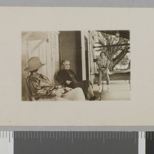 An older woman sits on a wide porch with a little girl to her right, and another person wearing a satin Western style shirt to the left. Title and date devised by cataloger.