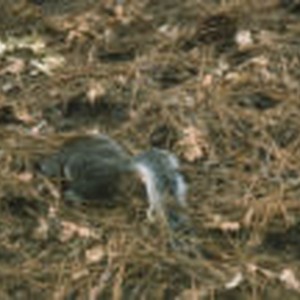 A grey squirrel rummaging among sticks and leaves in Frijoles Canyon.
