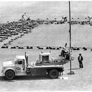 "Hughes Stadium is rapidly getting its face lifted in its conversion into a baseball park for the Pacific Coast League's Sacramento Solons, who open their home season April 16 against Spokane. As seen looking over the third baseline, workmen are cutting and removing sod. At left are rolls of sod cut between third and second base. In foreground an auger is making postholes"