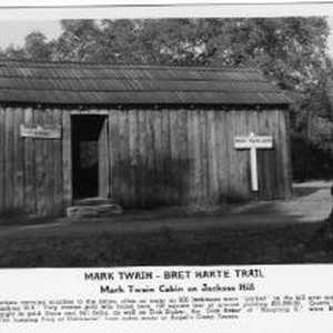 View of a replica of Mark Twain's Cabin on Jackass Hill in Tuolumne County. Landmark # 138. It was at this place that Twain gathered material for the "Jumping Frog of Calaveras"