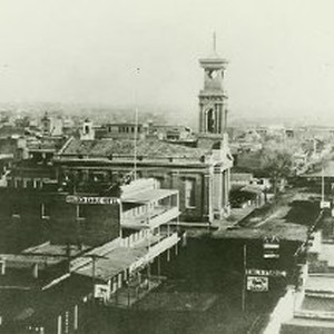Elevated view looking down K St. from 7th. Golden Eagle Hotel and St. Rose of Lima Catholic Church to left. Toll's Stable and the City Horse Market to right. High resolution scan available.