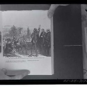 An unidentified person hold a published illustration with the caption "The Swearing and Subscribingof the National Covenant in Greyfrair's Churchyard, Edinburgh, 1638. An effort by the Scottish Protestants to preserve a Presbyterian form of government......"