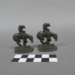 Pair of bookends, "End of the Trail", metal, antiqued brass finish. Each is a hollow half-casting of an American Indian rider, front plated, brass. American Indian is sluped on back of pony, which carries head and neck low and tail between legs; horse and rider are cast on subrectangular base. Copy of "End of the Trail" by James Earle Fraser.