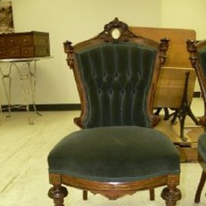 Green velvet and hardwood side chair , Renaissance Revival style. Shaped wood crest with porcelain plaque inset in center. Tapered trumpet legs with large bublbous turning at top. Turned pendants hang from both side corners of the back. Insized designs overall. One of two.