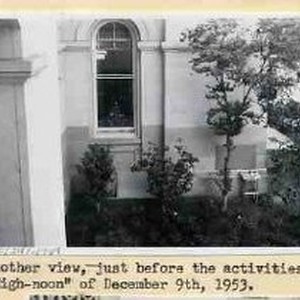 Typed on binder page "Another view, just before the activities started, 'High-noon' of December 9th, 1953". View of the corner of the Capitol building where the cornerstone was laid.