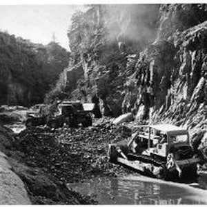 Heavy equipment is used to prepare Box Canyon for construction of the Box Canyon Dam on the Sacramento River.