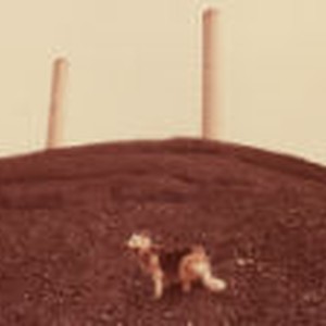 A dog stands on top of a pile of coal with two smokestacks in background.