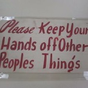Sign - Cardboard with red letters that read "Please Keep Your Hands Off Other Peoples Things". From Sacramento 'flop house', possibly the Adams Express Bldg.