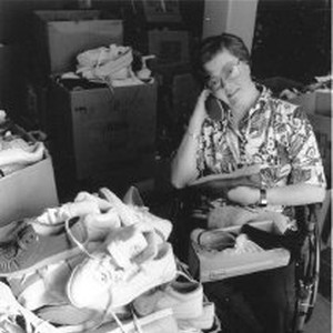 Woman in wheelchair tries to decide on which pair of shoes to purchase. Piles of shoes heaped in large boxes.
