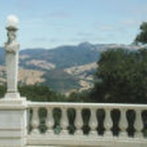 Rolling hills and mountains as seen from the Hearst Castle, with an ornate lamp post and banister in the foreground.
