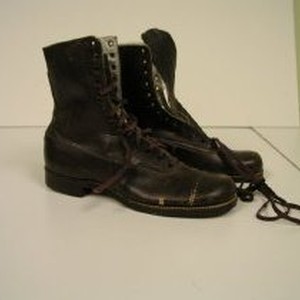 Child's brown leather lace-up boots; label "Playhouse Shoes" stamped on the sole; style number "310 5881 18264" stamped on white cotton lining inside boot.