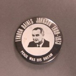 White text on black background. "Lyndon Baines Johnson 1908-1973 Peace was his dream" Memorial button