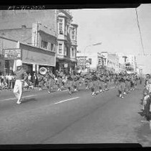A band marching in a parade down J Street at 9th Street. Mr. T's restaurant, Lewis' clothing store and Coast Radio are visible.