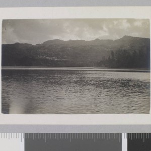 Lagoon in the foreground with hills and sky with clouds in the background.