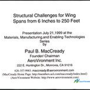 1999 July 21. Part of: Paul B. MacCready Papers ca. 1930-2002. Series 4: Writings and publications; Subseries 2: Talks; Box 12, Folder 3 Full Title: "Structural challenges for wing spans from 6 Inches to 250 feet," Materials, Manufacturing and Enabling Technologies Series