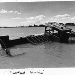 The decaying remains of an old workboat jutting from the San Joaquin River near Antioch.