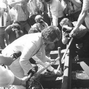 Sacramento Mayor drives spike as photogrphers and reporters surround her. (Perhaps for first Light Rail tracks that were completed in 1986)