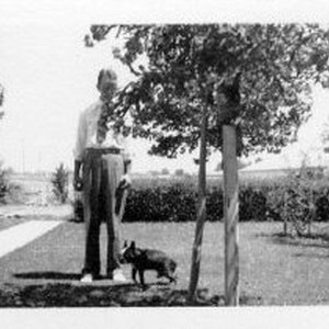 SERIES. Otto Dicks stands in yard of house at chicken ranch. One view shows dog with him.