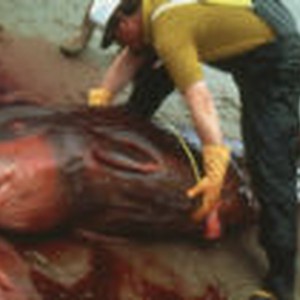 A man measuring less developed fetuses. The umbilical cord was cut near his hand.