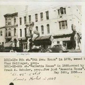 View of hotel at 1011-1013 5th St. It was known as the 5th Avenue House in 1875, Helvetia House in 1885, Ansonia Rooms in 1938.