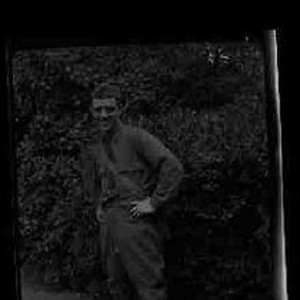 A soldier in uniform standing posed out of doors. Handwritten on the envelope "Hx In Fra---- Gas Mask"