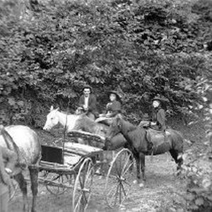 Family riding horses and carriage forested area.