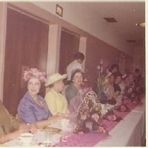 Women seated at long banquet table.