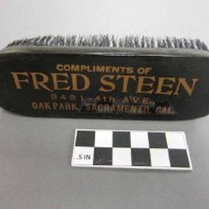 Black shoe brush with lettering that reads "Compliments of Fred Steen, Oak Park"