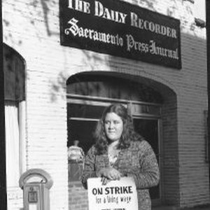 Young woman holds sign while striking in front of The Daily Recorder and Sacramento Press Journal building. It says, "On Strike for a Living Wage. . . Newspaper Guild Local 92, International Typographical Union Local 46."