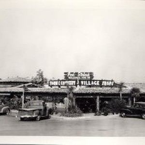 Cars parked in front of shopping center, sign above building says, "Jere Strizek welcomes you to Town & Country Village Shops."