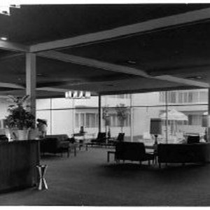 "This is a view of the lobby from a spot near the entrance of the Carl Greer Inn, new hostelry at Auburn Boulevard and Fulton Avenue. Beyond the windows is an atrium type court containing the inn's swimming pool."