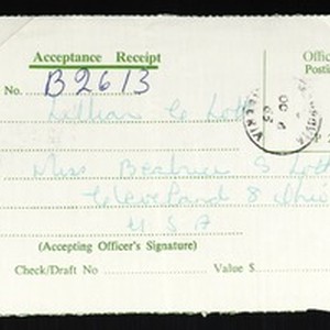 Registered receipt for mail delivery, Lillian C. Lott to Beatrice S. Lott, Cleveland, Ohio, 1965 October 6. [Description English/roman)]