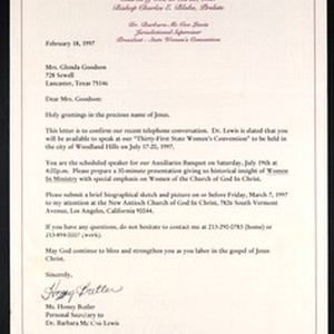 Barbara McGoo Lewis (Church of God in Christ), Los Angeles, California, letter, 1997 February 18, to Glenda Williams Goodson, Lancaster, Texas. [Description English/roman)]