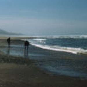 Panoramic view of the coastline at Morro Bay with two students looking for shells.