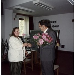 Photograph of Mihael Kuzmič giving a rose to a student after the end of a course. [Description English/roman)]