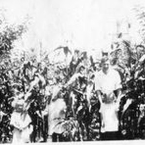 Ludford W. Elvy in front of a crop of corn with his daughters Wilma, Harriet and Phillis next to her dad.