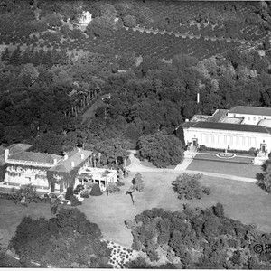A view of the residence and library building from the southeast. MS note on verso reads "Aerial view of Huntington grounds, Jan. 1937." Stamp on verso reads "Do not publish or reproduce without permission. Spence Air Photos, 2404 W. 7th St. Los Angeles."