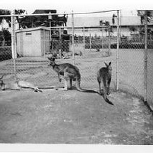 View of kangaroos in rear of the Autobahn building from the 1939 Golden Gate International Exposition, World's Fair on Treasure Island in the San Francisco Bay, which celebrated the completion of both the Golden Gate Bridge and the Oakland Bay Bridge.