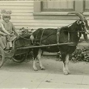 Young boy and girl pose for photo in a goat cart.