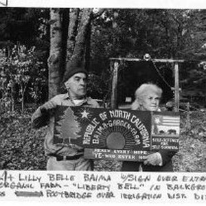 Val & Lilly Bell Baima showing their sign "Independent Republic of North California" in Nevada County. Also shows copy of Sacramento Bee article with the "Heads of State".