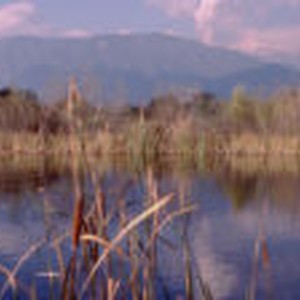 View north of Bernard Field Station lake with mountains in background.