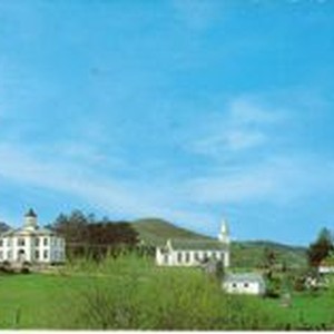 Postcard--colored, photo: St. Teresa's Catholic Church built in 1860 in town of Bodega on Jasper O'Farrell's property pictured in center of photo. The church was the center of an extensive Parish that included Healdsburg, Santa Rosa and Bodega. The white building on the left is the Potter School House. Handwritten message on back.