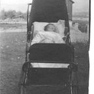 Photo--black and white: Infant Dorothy Kingwell in baby buggy circa 1916. Daugther of Alfred Leslie Kingwell (1892-1979). Leslie's parents were Benjamin Rowe Kingwell and Jessie Beedle Kingwell. Handwritten on verso: "Dorothy Kingwell To Mr. & Mrs. Kingwell" See similar photo #11555